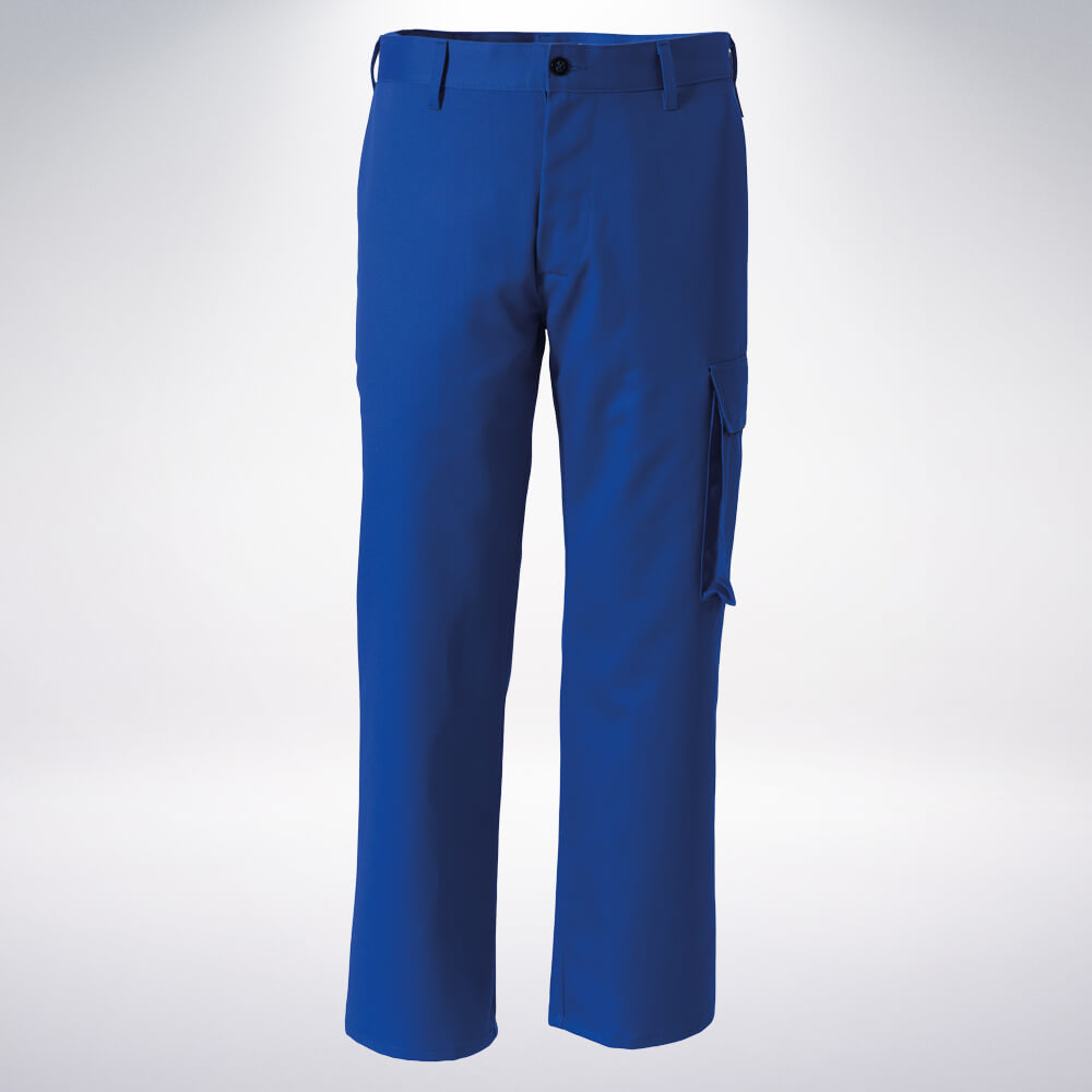 Buzunare și clape marcate în culori contrastante, 2 buzunare laterale oblice, buzunare spate cu clapă închisă cu capse ascunse, buzunar metru pliant cu aplicație telefon mobil pe piciorul drept, buzunar Cargo cu clapă pe piciorul stâng, găici curea, șliț cu nasturi.